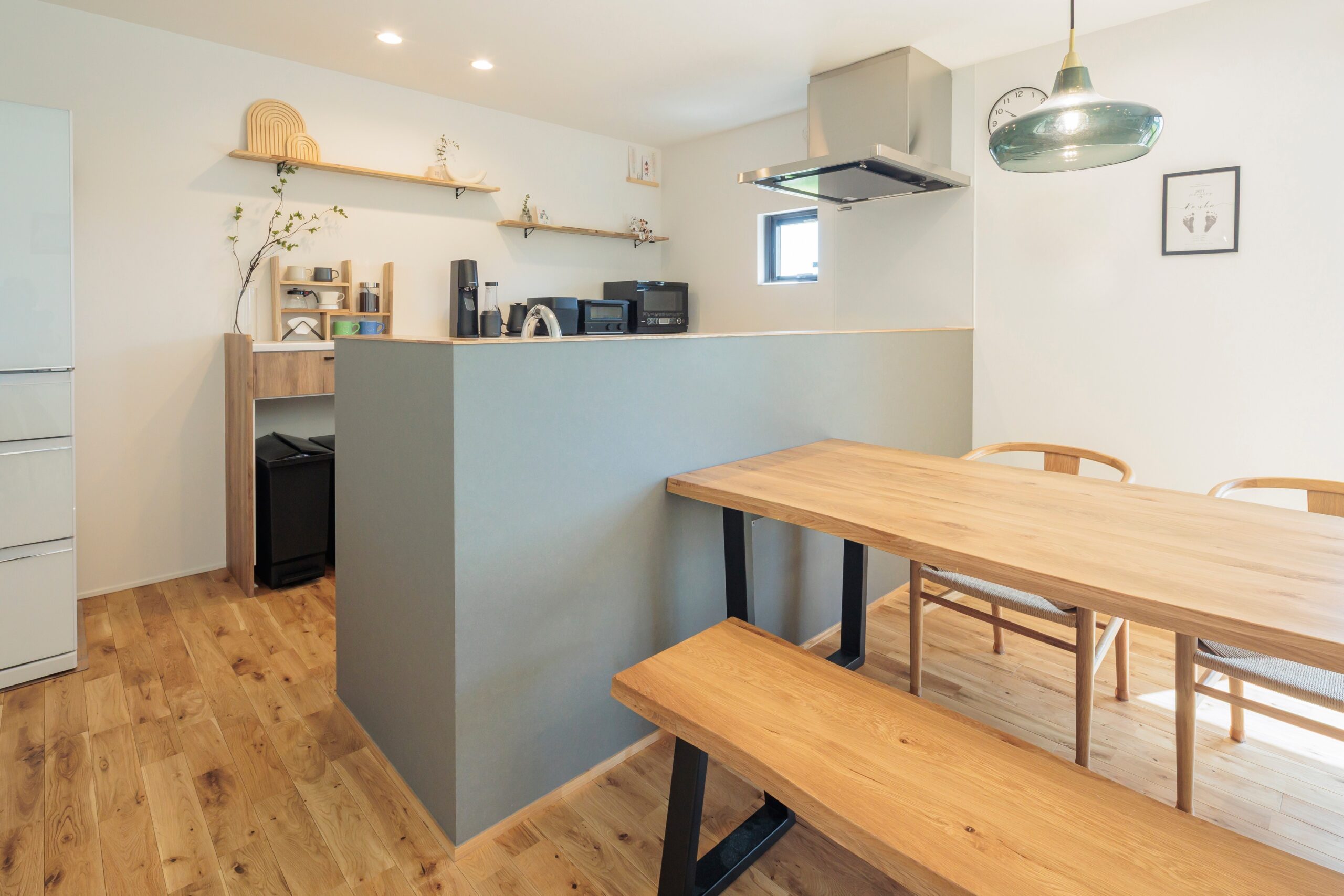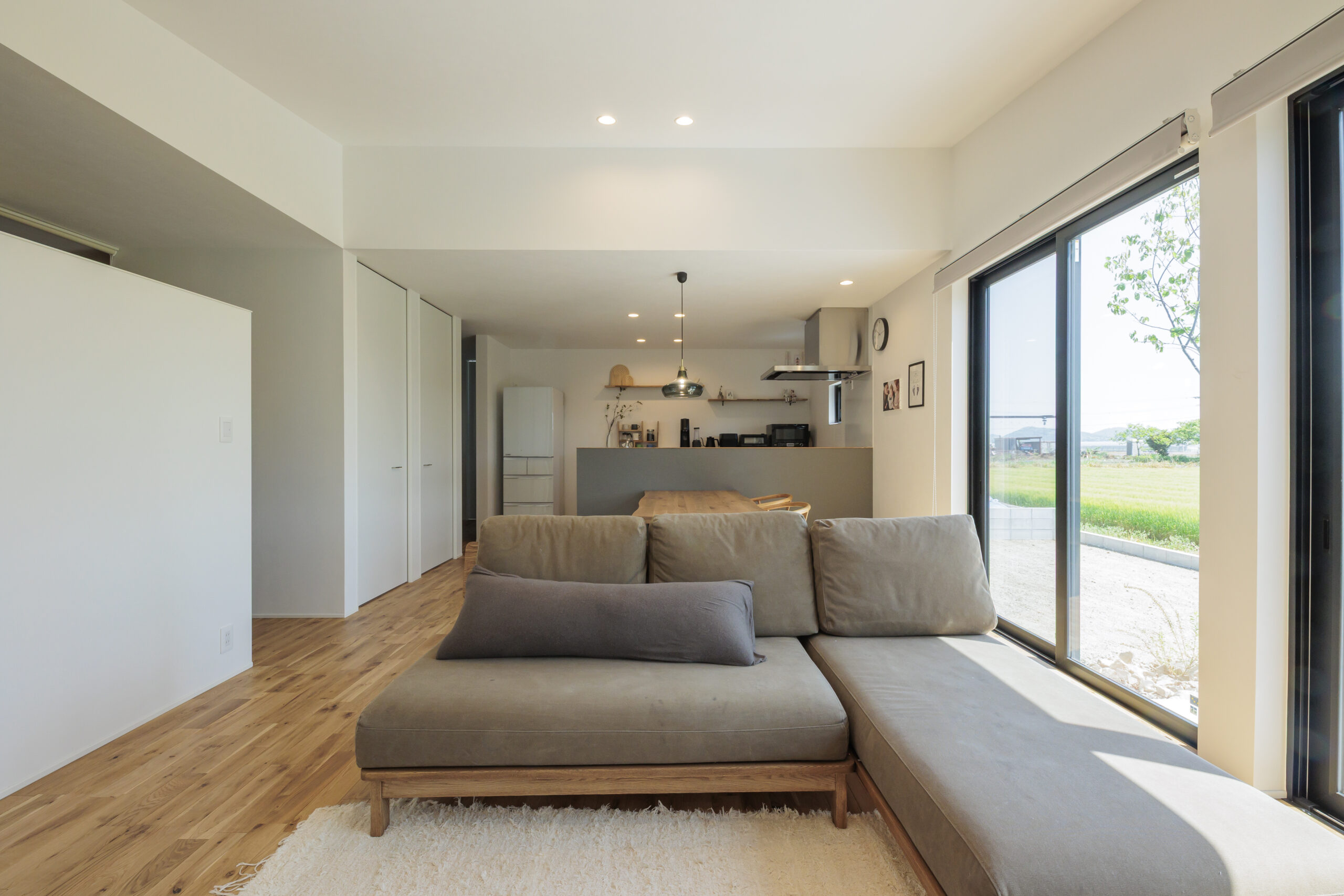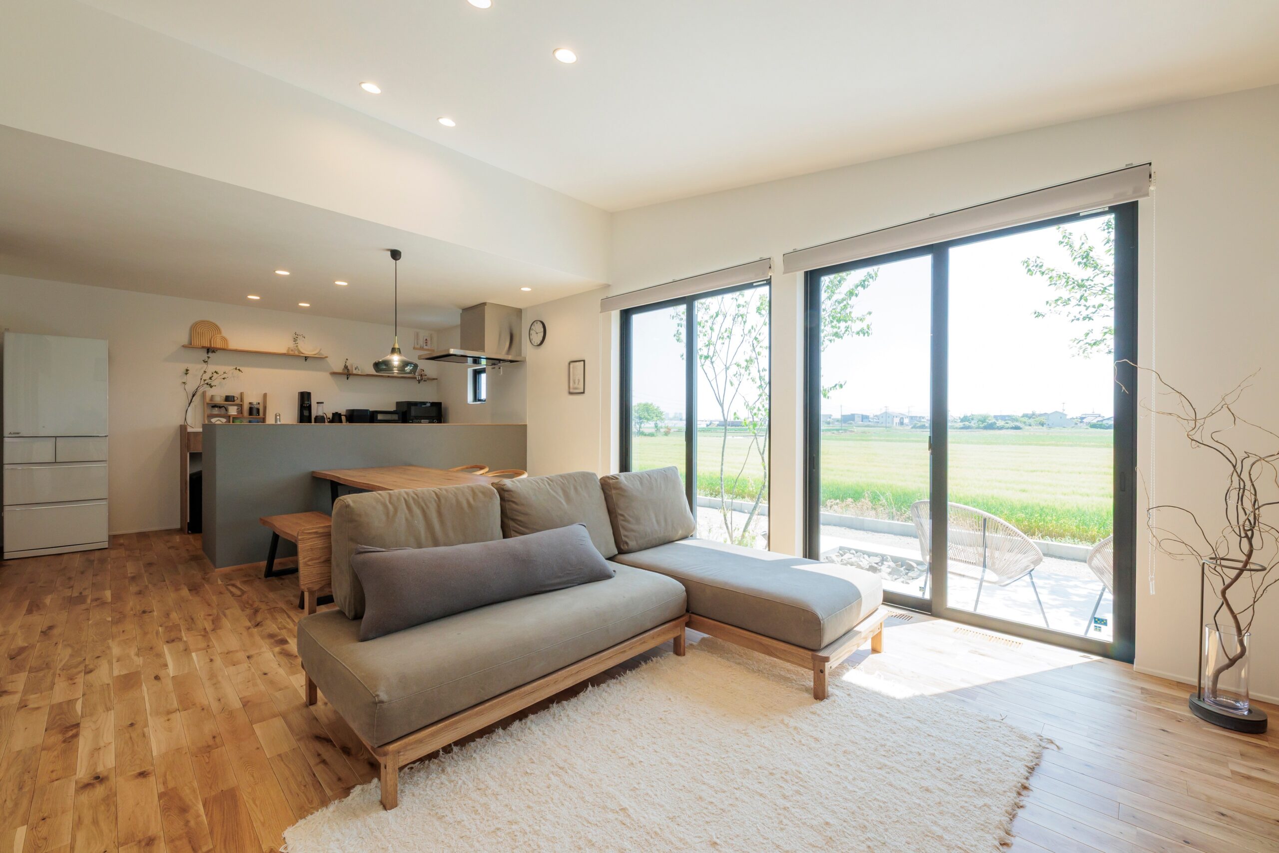 美しい風景に囲まれた土地に建つ平屋は、バイクガレージを備え、趣味を存分に楽しむ空間でご夫婦の要望を叶えました。接道側から玄関が見えない設計でプライバシーも配慮。色鮮やかなグレーと白、木目が織り成す美しい調和が、洗練された住まいが誕生しました。