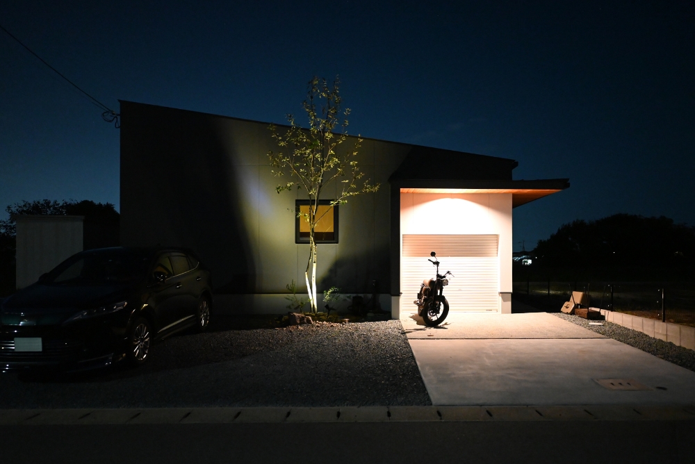 趣味のバイクを楽しむためのハーフガレージは、ご夫婦の想いが詰まった特別な空間。周囲の環境に配慮しつつ、デザインと実用性を両立した場所です。