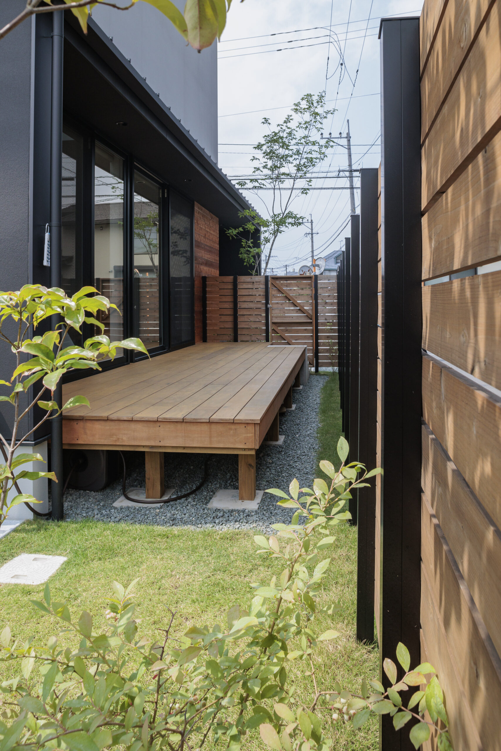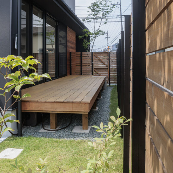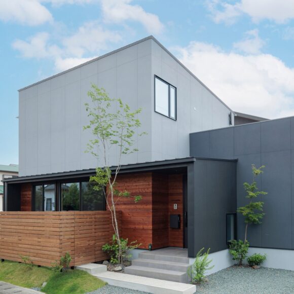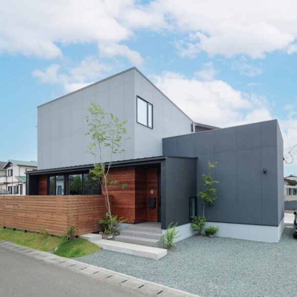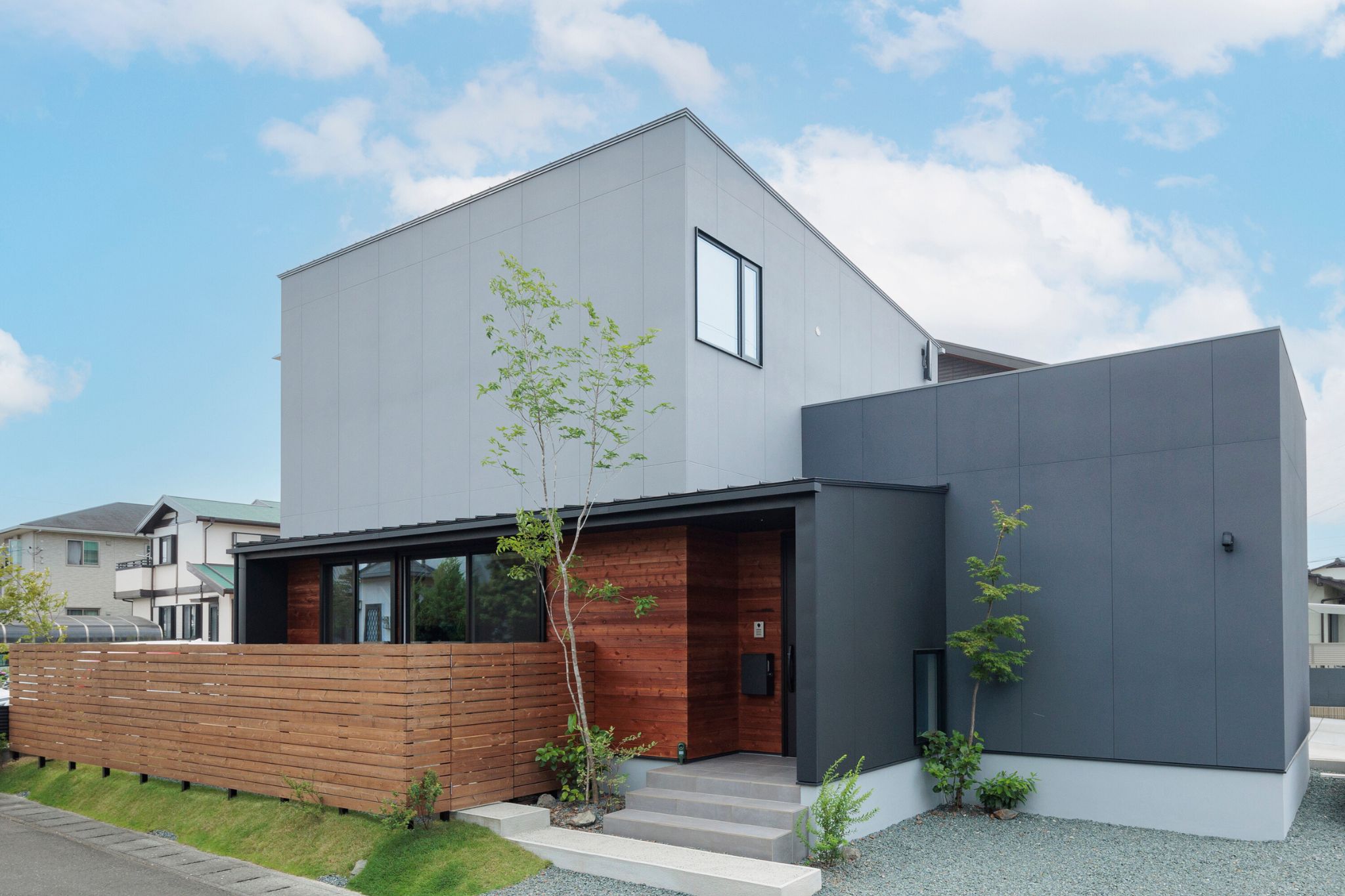 建物は2面道路に面しており、道路から少し離した配置により外からの視線を緩和しています。南側からは採光性を確保しながらプライバシーにも配慮した窓配置を採用。玄関近くには3台駐車可能な駐車場を配置しており、荷物の出し入れがスムーズに行えます。